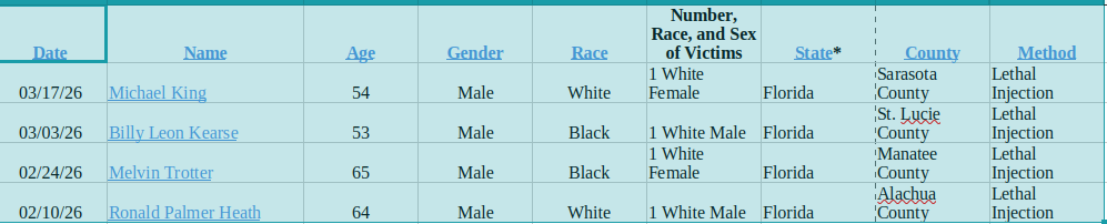 Scheduled and completed executions in Florida thru March 22, 2026: